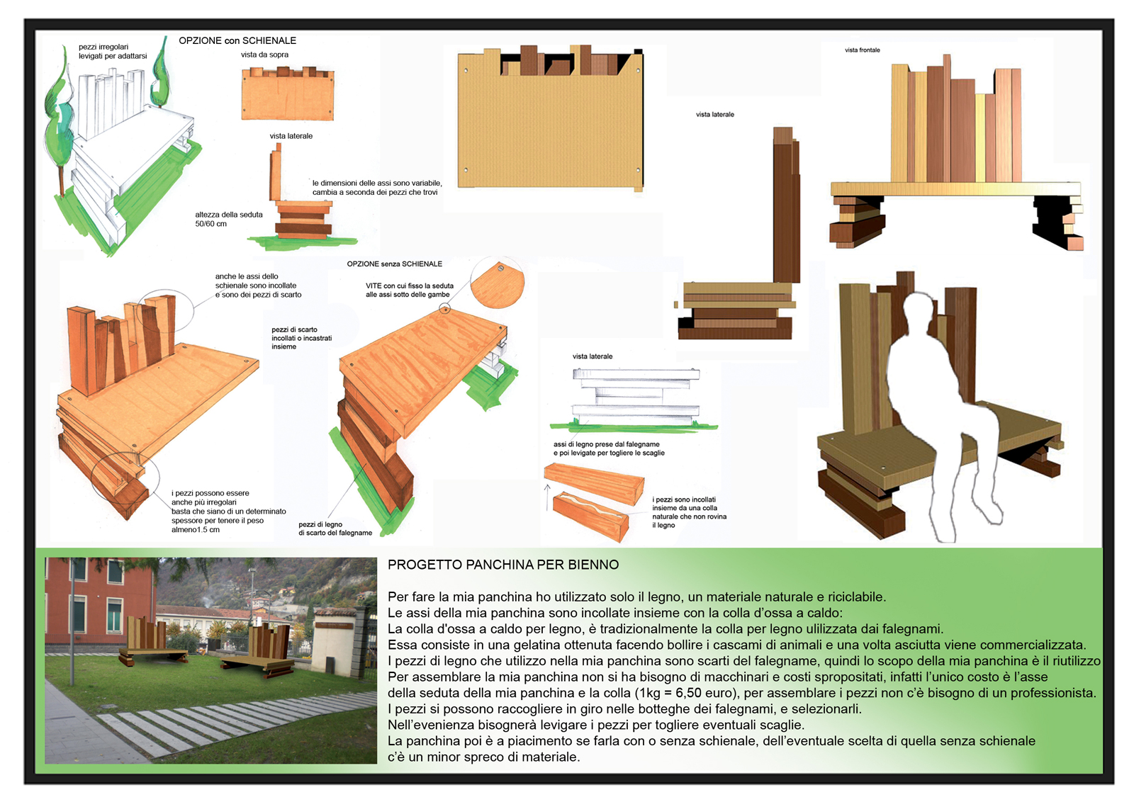 Panchina ecosostenibile per parco pubblico Progetto di una panchina ecosostenibile creata per il comune di Bienno tramite utilizzo di pannelli di legno ed incollati fra loro con una colla d'ossa a caldo, per ridurre al minimo i costi e l'impatto ambientale.