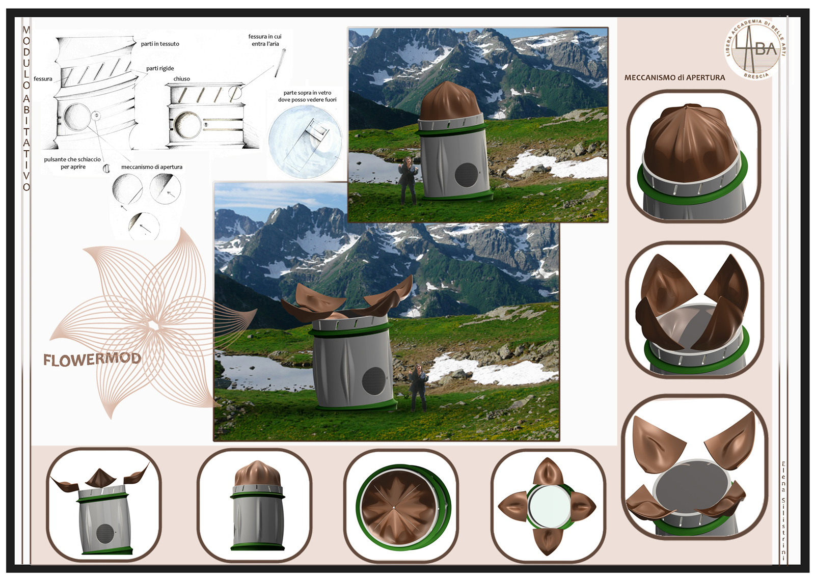 Flowermod: modulo abitativo Progetto modulo abitativo pensato per creare delle zone di sosta per riposare o per passare la notte durante le passeggiate in montagna. Il meccanismo di apertura e la struttura ricora i petali dei fiori che si schiudono per fare entrare la luce.
