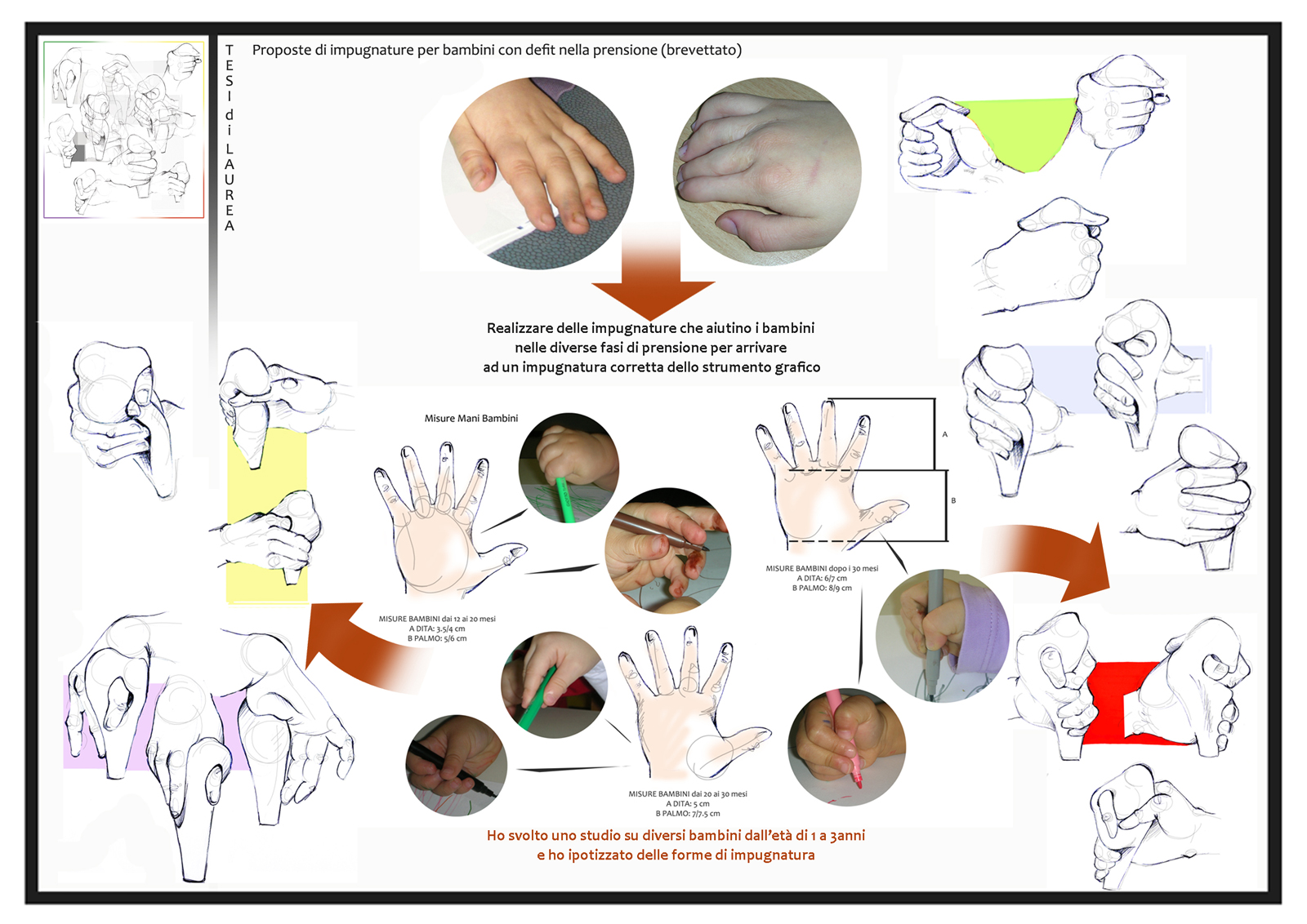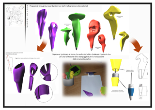 Penna per bambini disabili Nella mia tesi ho trattato delle fasi delle impugnature nei bambini con deficit di prensione e non, per arrivare ad ottenere una serie di impugnature che potessero adattarsi ad entrambi. Concludendo dopo aver studiato a fondo la prensione di molti bambini, dell'età compresa tra l'anno e i tre, ed essere stata in molti asili nido ed edifici specializzati, ho proposto quattro differenti impugnature per le diverse età dei bambini. Ho infine trasformato l'impugnatura in penna, usando materiali di uso comune, come plastica e metallo, e trasformando così un concept in un possibile oggetto commerciale. La biro avrà il pezzo superiore dell'impugnatura, diverso per le diverse fasi di età dei bambini, così da poter far arrivare ogni bambino all'impugnatura corretta. |